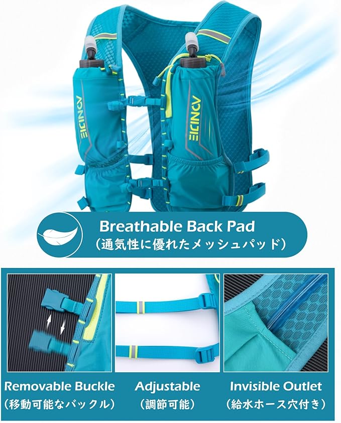 - Multiple Storage Spaces: Includes four front pockets for water bottles, phones, keys within easy reach. A large capacity compartment at the back holds a bladder, complemented by a elastic cord for a towel. Ensures ultimate convenience for your run