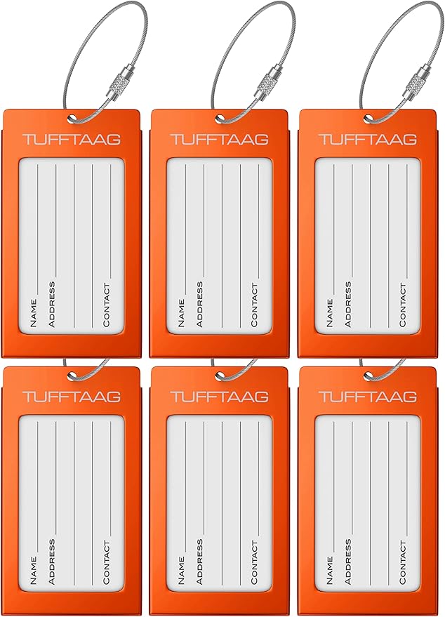 - 6-PACK METAL LUGGAGE TAGS FOR BUSINESS CARDS. 6 Orange Luggage Tags Bundle. Ensure your baggage arrives safe and secure at your final destination.