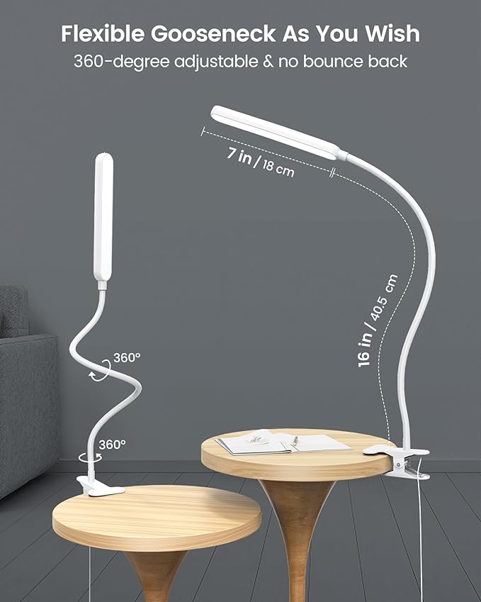 - [Sturdy Clamp & Flexible Gooseneck] This versatile clip on reading light features an ultra stable clamp with a 2.36" grip opening, ensuring solid attachment to any bed frame or desk without wobbling. Its 360° flexible gooseneck combines durable metal and silicone for dual protection, maintaining perfect positioning with zero bounce-back.
