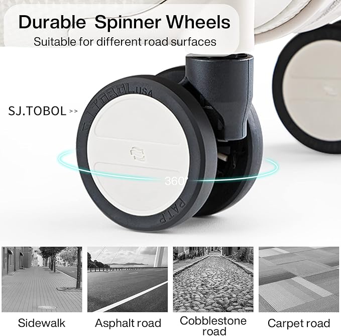 - 【High Quality Accessories】SJ . TOBOL durable spinner wheels,It is composed of precision shaft center and thickened TPE wheel skin, which is very wear-resistant,quieter and has strong bearing capacity, It is applicable to different roads such as cobblestone road and carpet road. Smooth and durable 5-strand reinforced explosion-proof zipper reverse coil prevents burst zipper. Travel-approved combination lock is safe and convenient. Ergonomics telescopic handle with multi-steps adjustment.