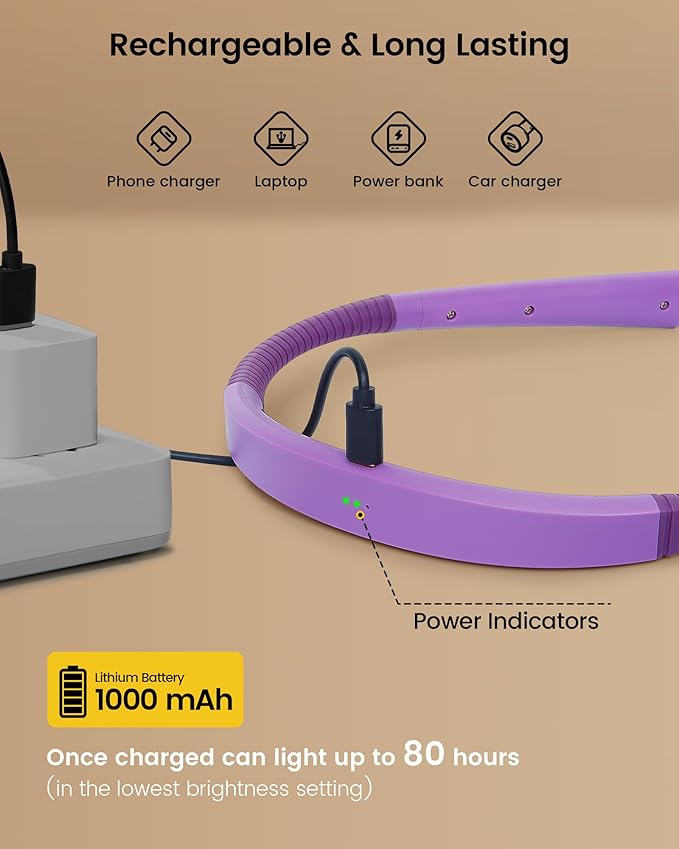 - [Rechargeable 1000mAh Battery] It's a USB-C rechargeable book reading light with undisturbed illumination. Thanks to the built-in 1000mAh battery, which can last up to 80 hrs at the dimmest level. After a full charge, you can enjoy reading for at least 20 days if you read 30 minutes daily, even at the brightest level. Besides, 3 indicators on the neck area remind you when you need to charge the light.