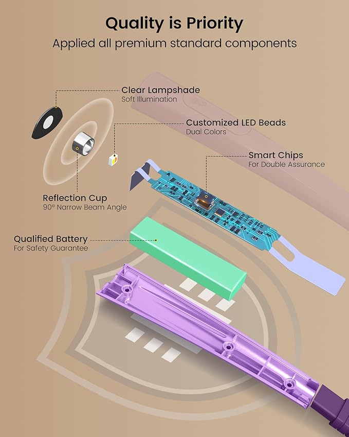 - [3 Colors & 3 Brightness Adjustable] 3 color temperatures: amber light (1800k) / warm white light (3200k) / cool white light (6000k). The special 1800k amber mode blocks 99.99% blue light for eye care. Choose amber light for reading in bed, cool light for knitting, and white light for repair. Also, this book light has 3 dimmable brightness levels; you can choose different light settings for multi-purposes.