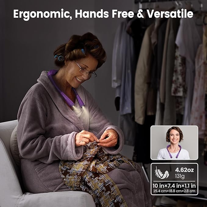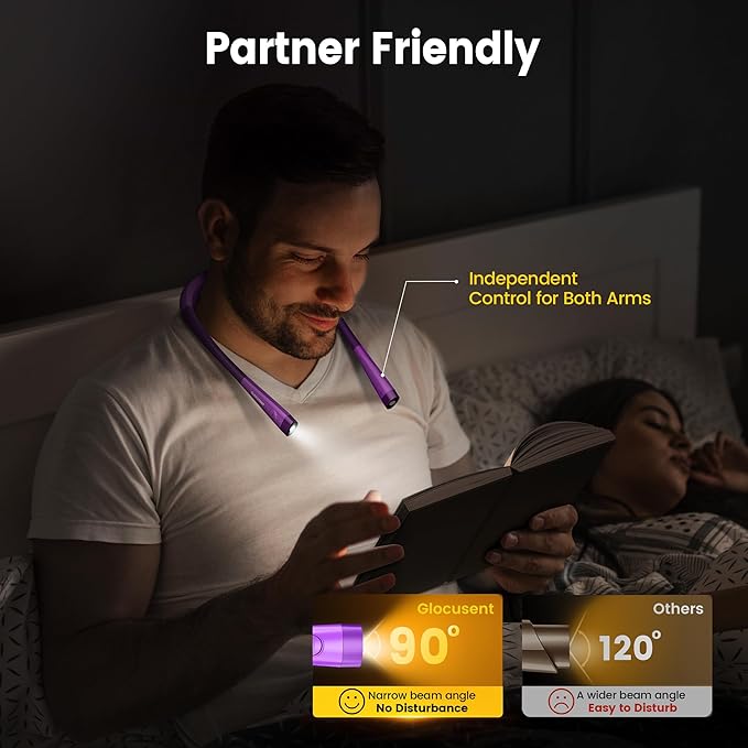 - [Partner Friendly & Versatile] Unlike other book lights for reading at night in bed, the Glocusent neck book light has a special narrow beam angle (90°) design. It is bright enough to illuminate the area you focus on while being dim enough not to disturb your sleeping partner. Additionally, the hands-free feature allows you to engage in various delicate activities such as knitting, walking, repairing, and more. Make it a perfect versatile book light.
