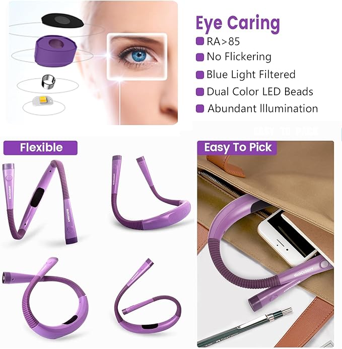 - [Eye Caring & Ergonomic Design] Blue light filter and no flickering design by the advanced LED beads of the Glocusent reading light. Compared with other reading lights for books in bed, you feel no more eye strain with the Glocusent book light. The arms of the reading light around your neck are supple and adjustable so you can get the angle most comfortable for you. This around the neck reading light is ergonomically designed, it is an exceptional handsfree neck lamp for reading!