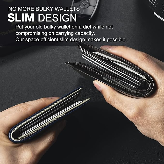 GSOIAX Mens Slim Wallet for Men Minimalist Genuine Leather Carbon Fiber Rfid Blocking Bifold Credit Card Holder With Gift Box (Dark Blue and Beige)