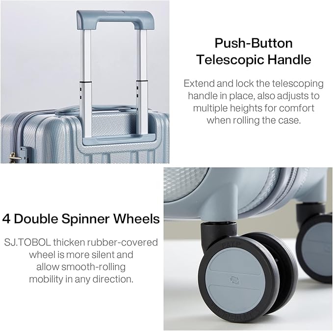 - 【High Quality Accessories】SJ . TOBOL durable spinner wheels,It is composed of precision shaft center and thickened TPE wheel skin, which is very wear-resistant,quieter and has strong bearing capacity, It is applicable to different roads such as cobblestone road and carpet road. Smooth and durable 5-strand reinforced explosion-proof zipper reverse coil prevents burst zipper. Travel-approved combination lock is safe and convenient. Ergonomics telescopic handle with multi-steps adjustment.
