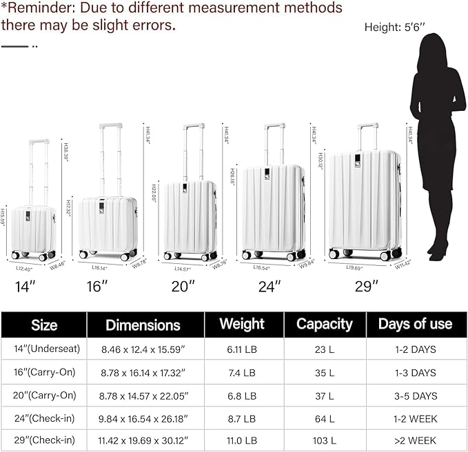- 【Product dimensions】Including wheels and handles(can ont expandable),24 inch Checked in luggage airline approved : L16.54 x W9.84 x H26.18", 64L, 8.7LB.