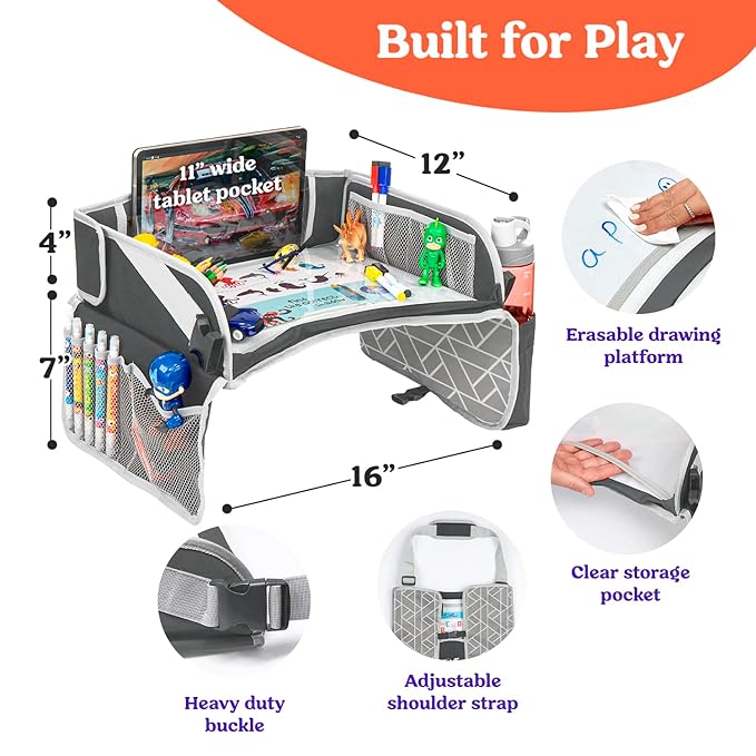 - 【Portable Carseat Tray and Road Trip Must Haves】- Our car seat tray for kids has a compact size of 16.5 x 13 x 4.5 inches with easily accessible organization pockets. It sits securely on a child's lap and allows kids to enjoy road trips while drawing with their art supplies, having snacks, or playing with their favorite toys. This car seat tray will give parents the advantage of enjoying a quiet ride while their kids stay entertained when traveling or during airplane flights!