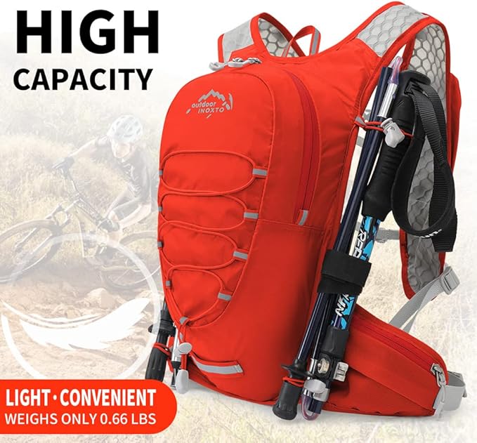 - 【Ultra Lightweight Design】High-quality nylon material and ultra-lightweight design, more comfortable to exercise,IX INOXTO sports backpack only weighs 190 grams, 12(H) x 2(W) x 8(L) inches ,the main compartment can hold 3 liters, the left and right shoulders have pockets for storing 250 ml PET bottles, and There's a pocket for your phone and stuff, and you can jog while listening to music.