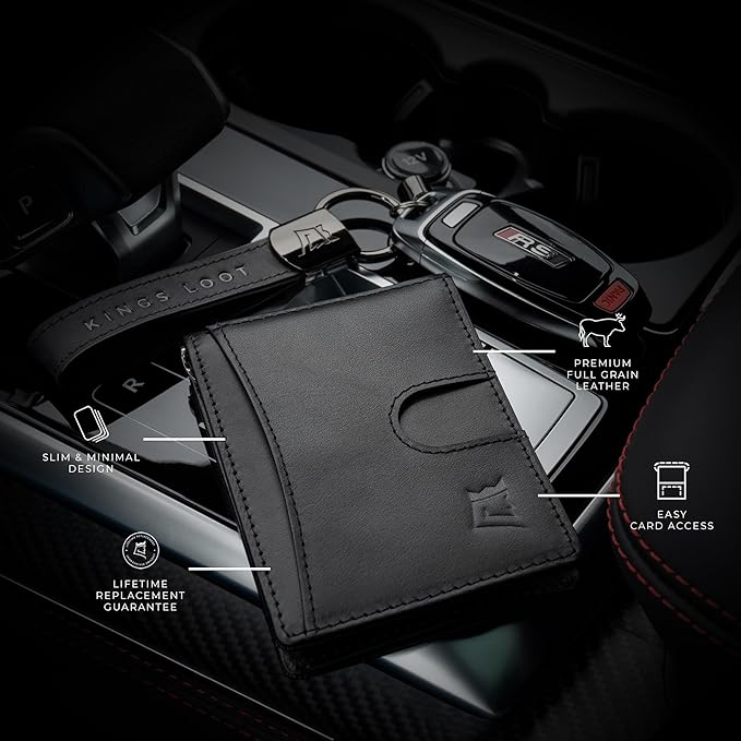 Kings Loot Money Clip Slim Minimalist Wallet for Men – RFID Blocking Leather Design with Money Clip – Front Pocket Bifold Holds 12 Cards – Stylish & Compact Wallets (Black)