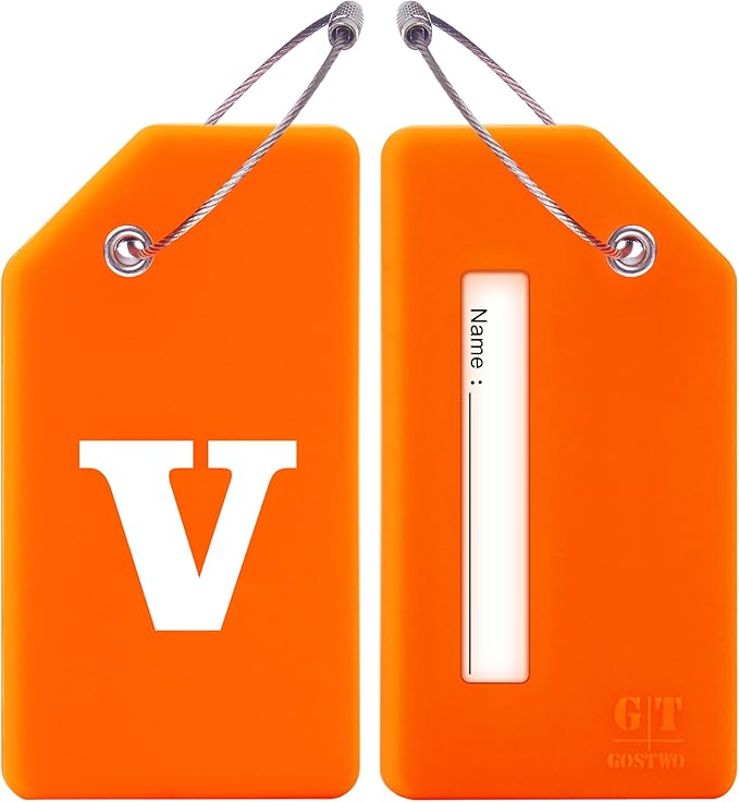 Gostwo 2 Pack Silicone Luggage Tags for Suitcases, 26 Initial Letter Baggage Labels Handbag School Bag Suitcase Instrument Tag with Stainless Steel Loop(Orange)(Letter V)