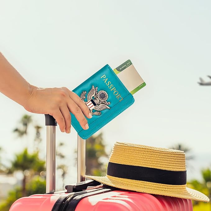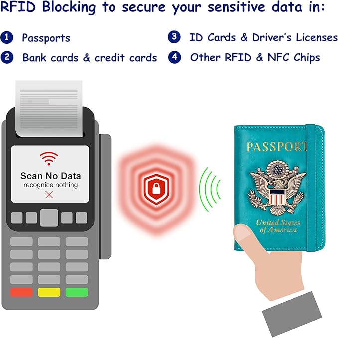 - RFID Security: The leather passport holder rfid blocking has a special material to block RFID signals so that the passport organizer can protect your personal information in your passport and credit cards from unauthorized scans. RFID blocking shielding material of the passport holder men women is used to prevent thieves from swiping your credit card to steal your personal information in airports or crowded places.