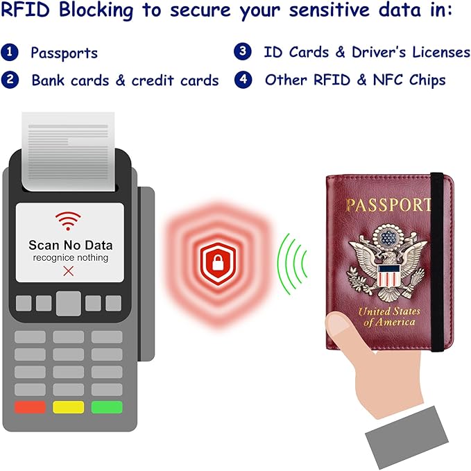 - RFID Security: The leather passport holder rfid blocking has a special material to block RFID signals so that the passport organizer can protect your personal information in your passport and credit cards from unauthorized scans. RFID blocking shielding material of the passport holder men women is used to prevent thieves from swiping your credit card to steal your personal information in airports or crowded places.