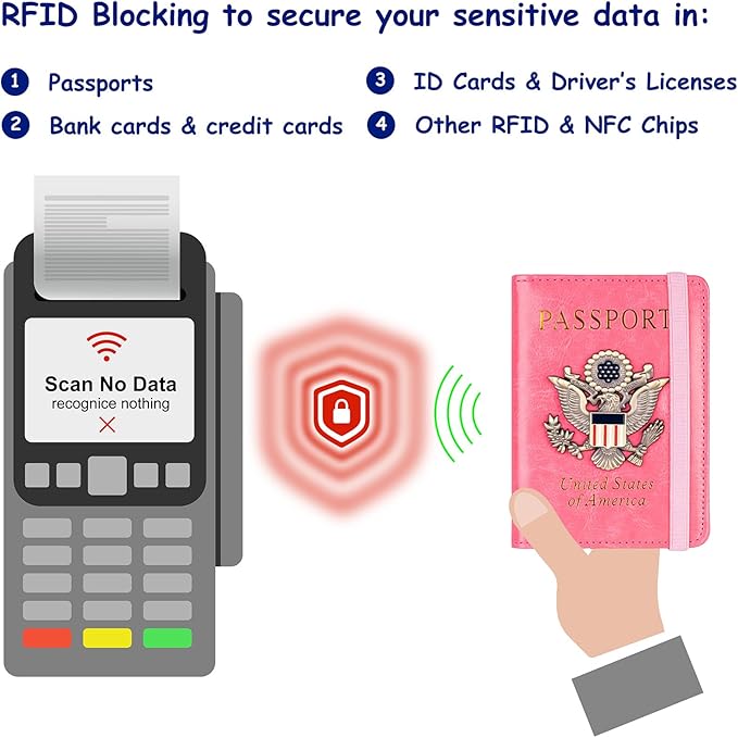 - RFID Security: The leather passport holder rfid blocking has a special material to block RFID signals so that the passport organizer can protect your personal information in your passport and credit cards from unauthorized scans. RFID blocking shielding material of the passport holder men women is used to prevent thieves from swiping your credit card to steal your personal information in airports or crowded places.