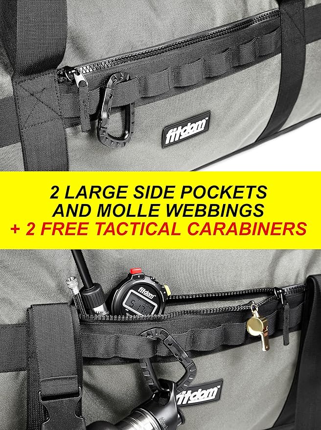 - FIELD TESTED AND FOR ATHLETES ON THE GO – We are passionate with our product and designed our dufflebag with real life encounters. Molle webbings were added for attaching keys, water bottles and other accessories on the go. 4 ventilating holes reduce bad smell when carrying wet cloth or other items. 2 extra tactical carabiners are included for your convenience. We are proud to say our long duffell is not just a bag but a companion for your outdoor activities.