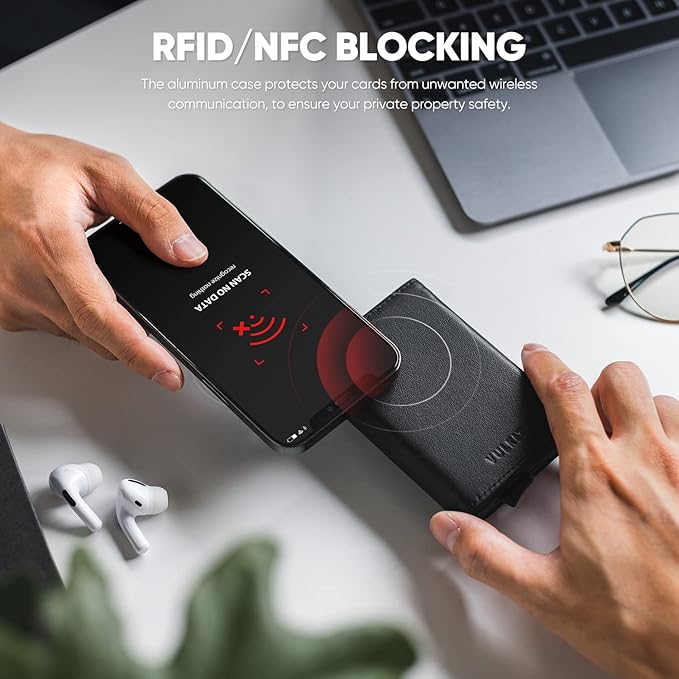 - RFID/NFC Blocking Card wallet- Integrated aluminum case protects your cards from unwanted wireless communication, keeps your private property safety.
