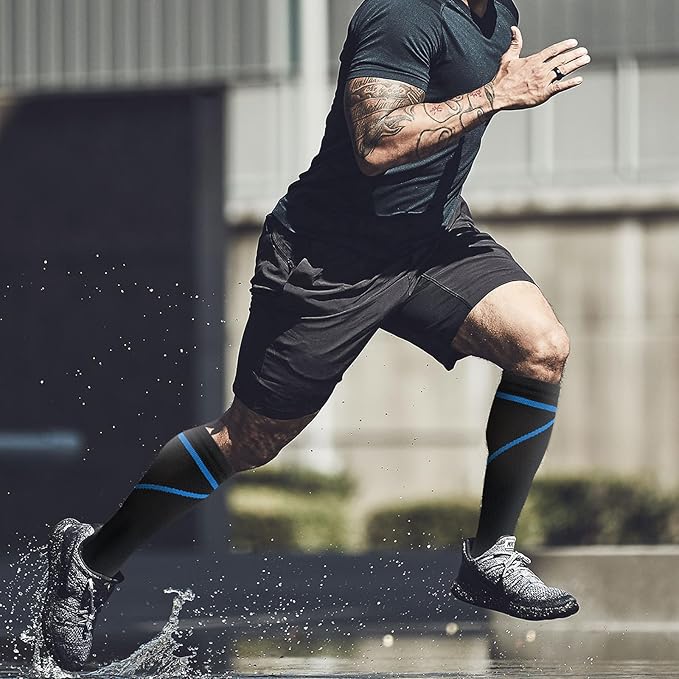 - Compression socks for men and women promote blood circulation by applying a certain amount of pressure to the legs. It reduces pain and swelling when you stand or run for long periods of time.