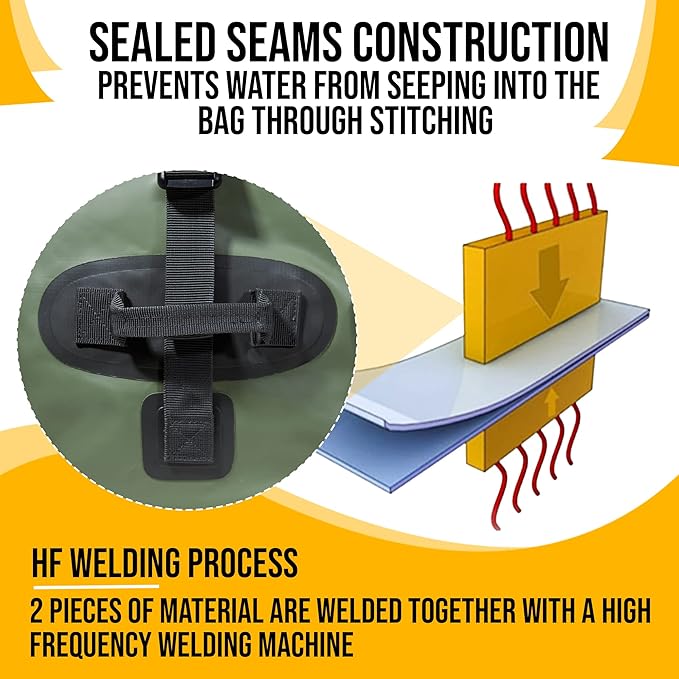 - TOUGH ENOUGH FOR EVERY ADVENTURE: Built with ultra-durable waterproof PVC and reinforced welded seams, this dry duffle bag resists rips, tears, and wear. Whether used as a fishing duffle or a rugged boat bag, it’s designed to withstand the harshest conditions.