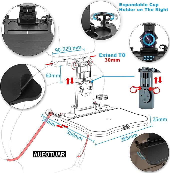 - 【MULTIFUNCTIONAL CAR BACK SEAT TRAY TABLE】It has a table, two cup holders, and a phone holder that can be rotated 360°. The phone holder can be extended up to 9 cm to fit most smartphones on the market. 360° rotation allows you to watch mobile videos at any angle. The table is adjustable up and down and can be easily used by both children and adults. It's easy to work, eat, read, write, watch videos or put drinks in the car. It will provide entertainment for you and your passengers.