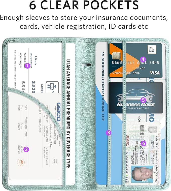 - 6 COMPARMENTS: Comes with 3 large pockets for insurance documents, vehicle registrations cards and other valueable information. And 3 small pocket for driver's license, ID cards, business cards, key contact information cards.
