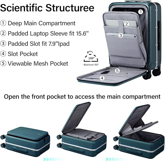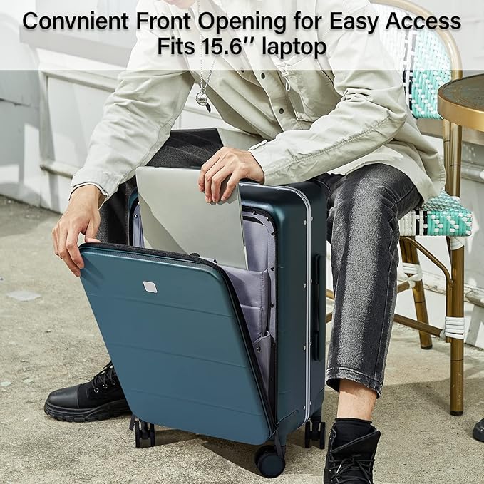 - FRONT OPENING: MILADA airline approved carry on luggage 22x14x9 with front laptop compartment for quickly accessing electronics, like 15.6'' laptop, iPad, folder and more urgent items. The aluminum frame make the suitcase sturdier (front access only). 20 inch suitcase carry on with front laptop pocket is 13.81×9.25×21.46in, 7.93Ibs, 40.4L capacity. Internal dimensions: 12.6*8.3*15.3"