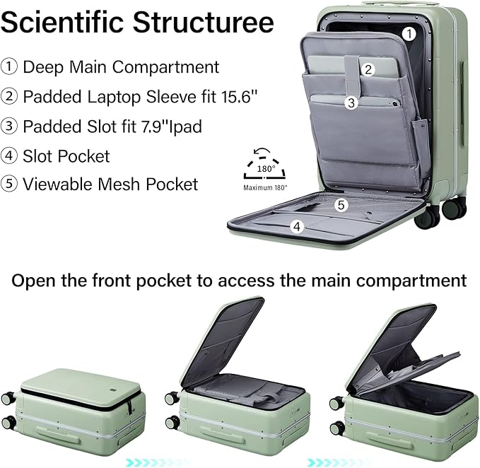 - PRACTICAL INTERIOR DESIGN: MILADA hard case luggage carry on suitcase , the front compartment with a padded sleeve for 15.6'' laptop, 11'' Ipad pocket, 2 divider slot pocket and a viewable mesh pocket holds small accessories. Then front access to the deep main compartment that with cross strap to keep items secure and wrinkle free, not accidentally lose stuff.