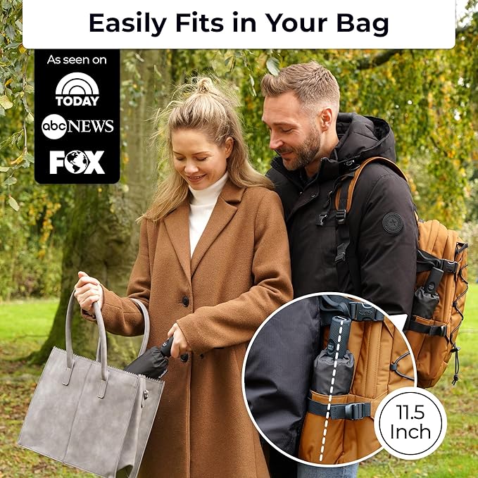 - LIGHTWEIGHT, EASY ONE-HANDED USE, SMALL & PORTABLE: Take this compact umbrella for travel with you wherever you go. So versatile and simple to use, with just the touch of a button, you can automatically open or close your Tumella. It fits perfectly in your backpack, purse, or car door, with just 11 by 2.75 inches in size, weights less than 1 lb, while offering a huge coverage of 42 inch.