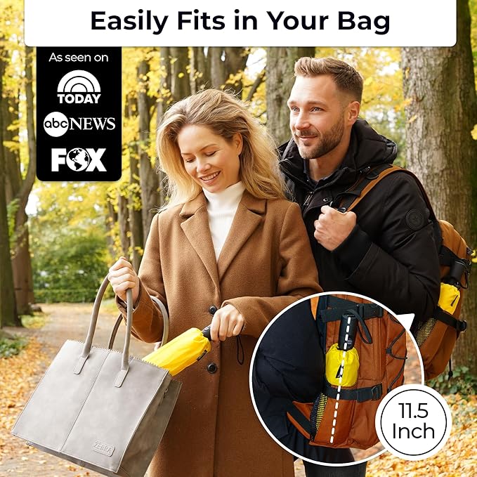 • LIGHTWEIGHT, EASY ONE-HANDED USE, SMALL & PORTABLE: Take this compact umbrella for travel with you wherever you go. So versatile and simple to use, with just the touch of a button, you can automatically open or close your Tumella. It fits perfectly in your backpack, purse, or car door, with just 11 by 2.75 inches in size, weights less than 1 lb, while offering a huge coverage of 42 inch.