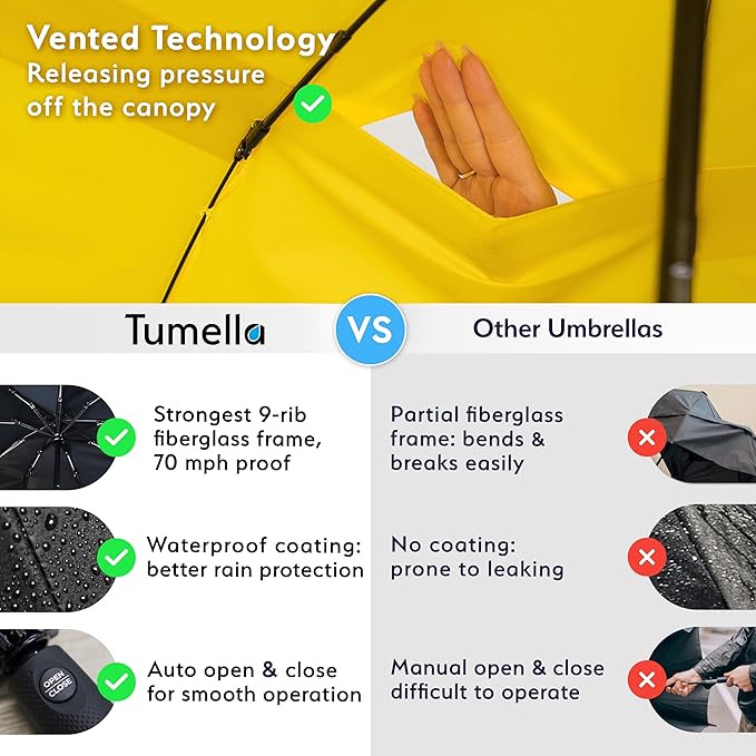 TUMELLA Strongest Windproof Travel Umbrella (Compact, Superior & Beautiful), Small Strong but Light Portable and Automatic Folding Rain Umbrella, Durable Premium Grip, Fits Car & Backpack