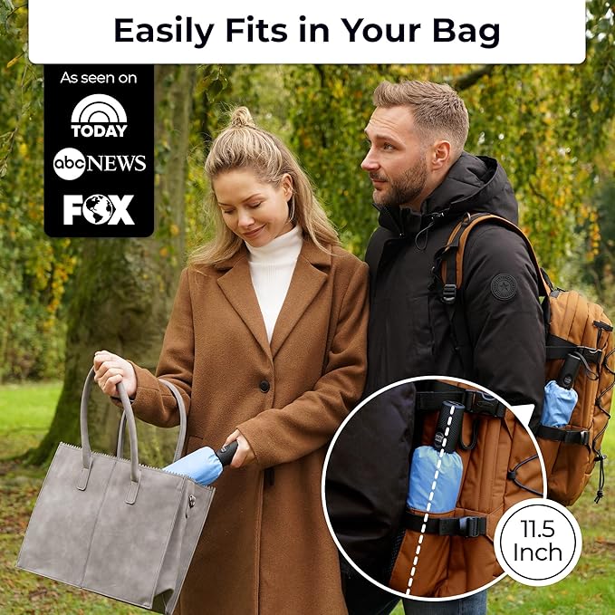 • LIGHTWEIGHT, EASY ONE-HANDED USE, SMALL & PORTABLE: Take this compact umbrella for travel with you wherever you go. So versatile and simple to use, with just the touch of a button, you can automatically open or close your Tumella. It fits perfectly in your backpack, purse, or car door, with just 11 by 2.75 inches in size, weights less than 1 lb, while offering a huge coverage of 42 inch.