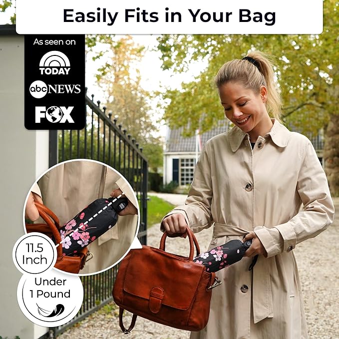 - LIGHTWEIGHT, EASY ONE-HANDED USE, SMALL & PORTABLE: Take this compact umbrella for travel with you wherever you go. So versatile and simple to use, with just the touch of a button, you can automatically open or close your Tumella. It fits perfectly in your backpack, purse, or car door, with just 11 by 2.75 inches in size, weights less than 1 lb, while offering a huge coverage of 42 inch.