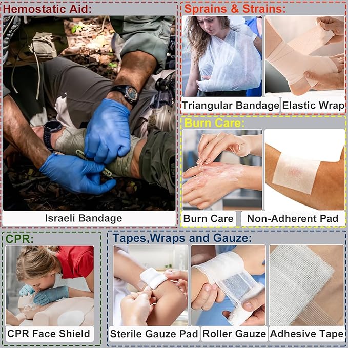 - ✅【 FIRST AID KIT CONTENT】Not only medical supplies that meet family emergencies. Including bandages, sterilize supplies, dressings, israeli bandage edc. It also contains many outdoor survival equipment, such as tactical flashlight (no batteries),tactical knife,flint fire starter,10ft paracord bracelet with a compass, Whistle, emergency blanket and poncho.