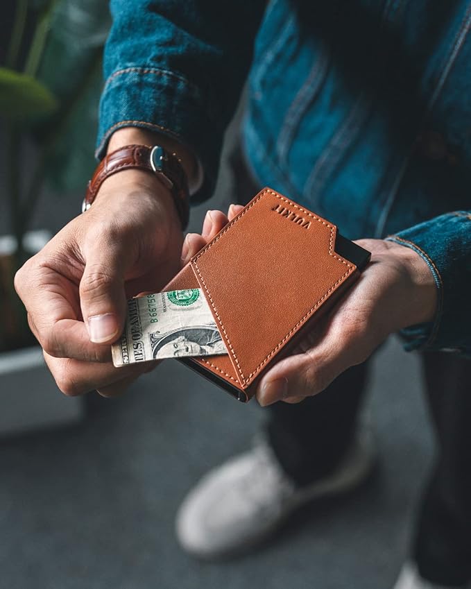VULKIT Pop up Card Wallet RFID Blocking Slim Aluminum Metal Bank Card Holder Case with Business Money Pocket for Credit Cards Notes and Coins (Brown)