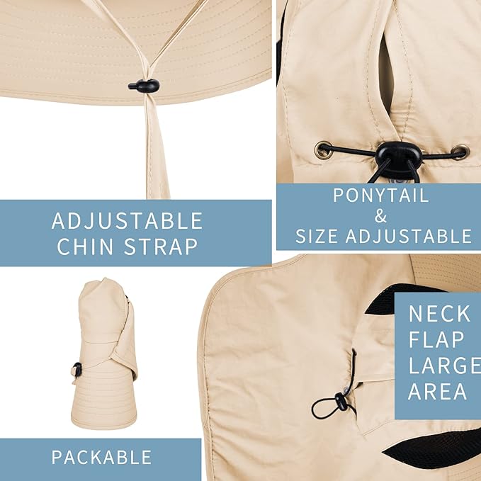 - PERFECT SUN PROTECTION FOR HEAD AND NECK – The outdoor hat has a large wide brim and neck flap to protect you from the blazing sun at all angles. The hat is rated for 50+ UPF to protect against harmful UVA and UVB rays, offering complete UV protection for your face, ears, and neck.