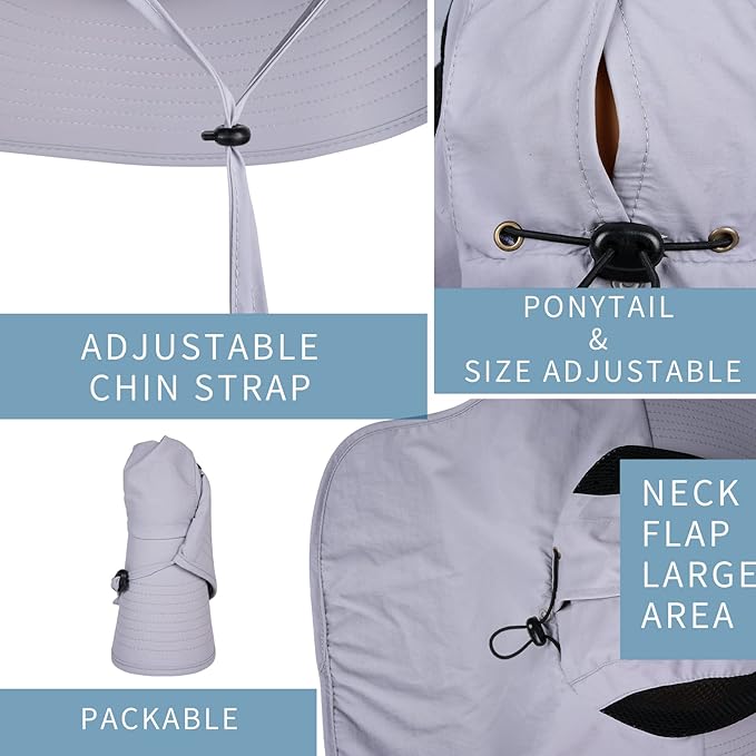 - PERFECT SUN PROTECTION FOR HEAD AND NECK – The outdoor hat has a large wide brim and neck flap to protect you from the blazing sun at all angles. The hat is rated for 50+ UPF to protect against harmful UVA and UVB rays, offering complete UV protection for your face, ears, and neck.