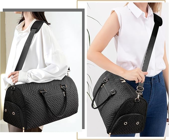 - TRAVEL BAG WITH SHOE COMPARTMENT - We have added a separate shoe compartment and a shoe bag(Size:17x12 inches). Travel bags for women has a shoe compartment to hold your shoes or dirty clothes, making it easy to separate them from your clean clothes when travelling. It also comes with a toiletry bag in which you can put your cosmetics, skincare products or toiletries.(Black)