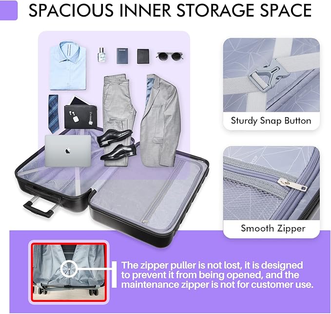 - [Larger storage space] We have adopted a more scientific structure design to maximize the use space in the box, and reasonable internal partitions make your luggage more tidy and can accommodate more.