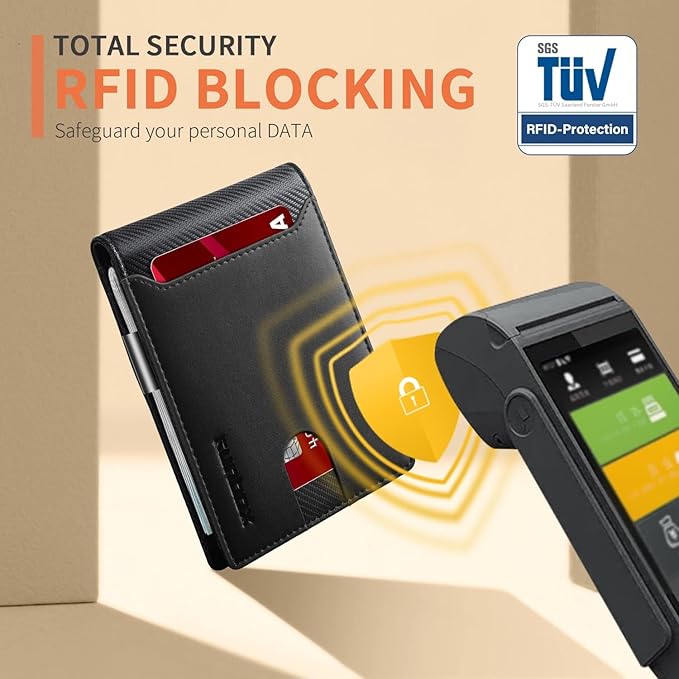 - ππ ππ ππ§ππ’-ππ‘πππ ππππππππ - this slim wallet for men equipped with German Instiute Certified RFID Security technology, a unique metal composite, engineered specifically to block 13.56 MHz or higher RFID signals to protect the valuable information and privacy