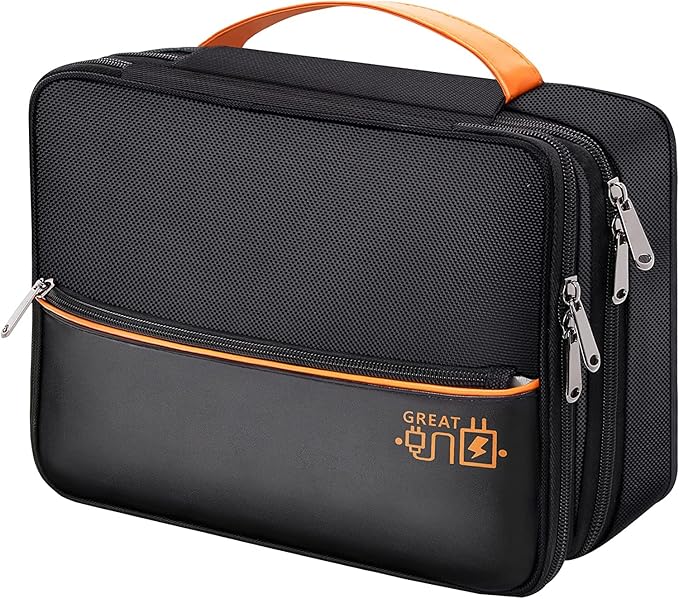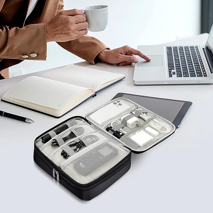 - 👍【DOUBLE LAYERS】- The electronics bag is designed with 2 Layers interior compartment, the upper compartment can be used to organize Cord, Charger, Cellphone, Flash Drive, Earbuds, the lower compartment can store Adapter, Hard Drive, Power Bank, Tablet Computer. The front pocket provides an easier way to store your Cellphone or Power Bank.