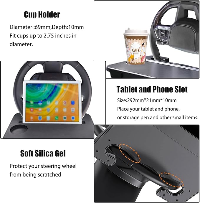 - [Steering Wheel Tray] The car steering wheel tray comes with non-slip desktop,cup holder and a storage groove,the size of desktop is 14.5" x 11", perfect for placing laptop,tablet,mobile phone,food,notebook and other items,convenient for your working,writing,eating in the car.Unique car eating tray for a quick snack or car laptop desk for a moving office while traveling.