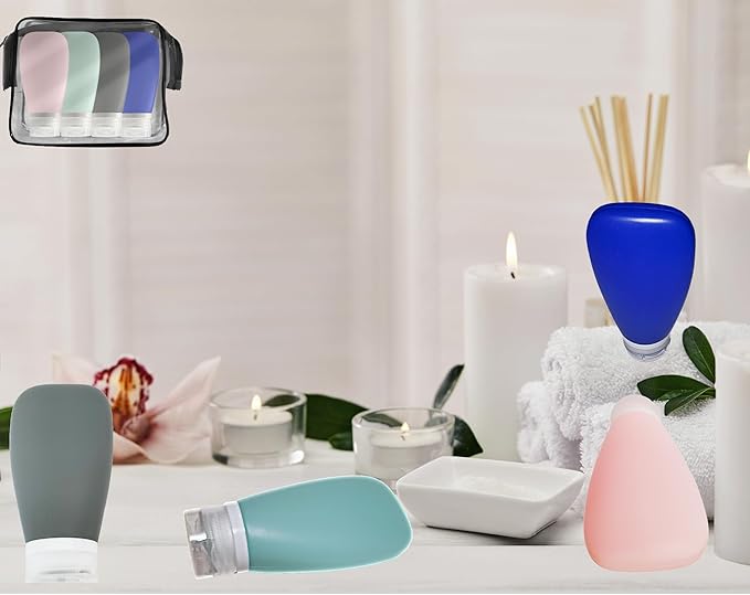 - TSA CARRY ON READY SIZE: 3oz 4-pk set of refillable containers, silicone travel bottles 90-mls just right for TSA approved size. Our signature soft squeezable on ALL sides style bottles, are refillable bottles that allows for continue refills for traveling convenience.