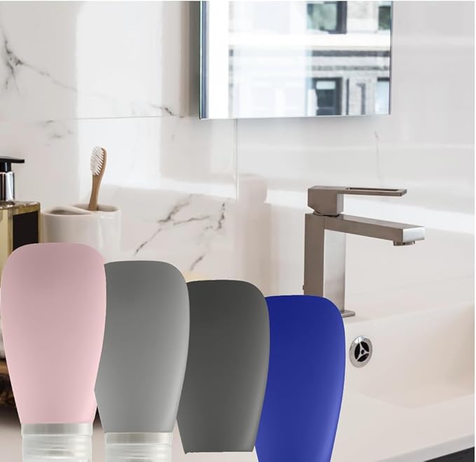 Travel Bottles for Toiletries, TSA Approved 3oz (90ml) Leak Proof Silicone Refillable Squeeze Travel Size Containers BPA Free for Cleansers, Lotions, Shampoo 4pk color (P,G,Blk,Blue)