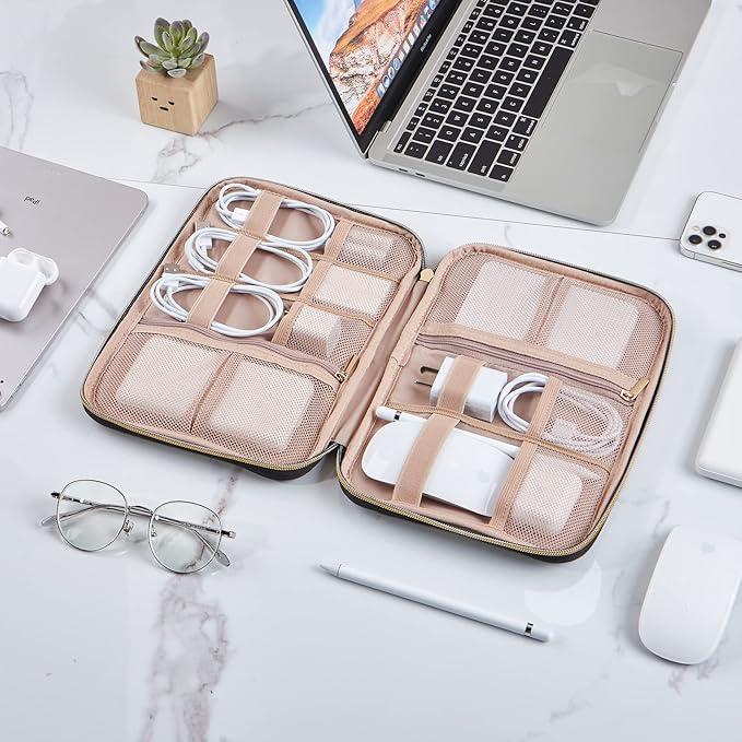 - LARGE CAPACITY-10.5×7.5×1.5inches(L×W×H); Spacious room for 4 cables, 1 mouse, 2 power bank(or potable hard drives, cables), 2 SD cards, 3 batteries, 2 USB drives and 1 charger