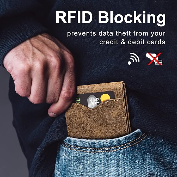 - Rfid Blocking: Our wallets are equipped with German Instiute Certified RFID Security technology, a unique metal composite, engineered specifically to block 13.56 MHz or higher RFID signals to protect the valuable information and privac.
