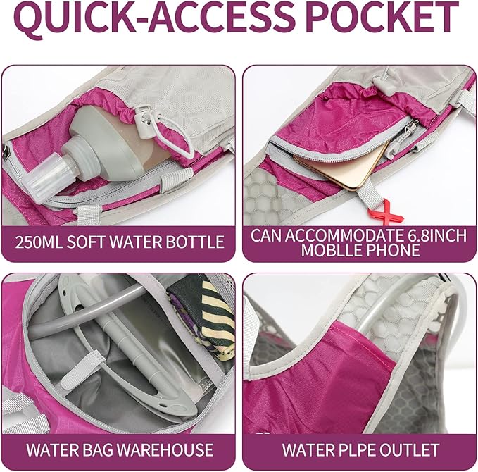 - 🚴【Security and Multiple Storage Pocket】Water backpack for hiking Reflective trim for night safety, has multiple pockets can store various necessities outdoor. The bottom front pocket allows you to quickly find what you need during hiking. Smaller quick access items without removing the pack, such as keys, wallet, gadget, sunscreen, phone, towel, or any other items. To travel light, efficient access, let you run faster and farther.