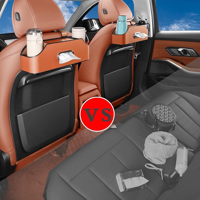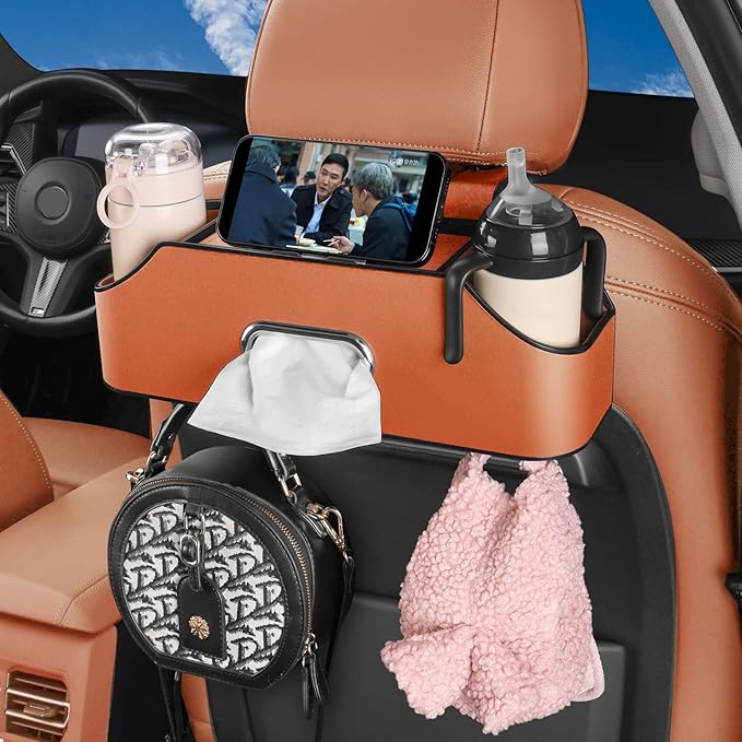 - Multi-Pocket Design: HOLDCY Car Seat Back Organizer is a Multi-purpose accessory that hangs on the back of your front seats or sits on the backseat itself. It has 2 cup holders and Tissue Box and Hook as cups, bottles, snacks, toys, wipes, tissues, umbrellas and more.