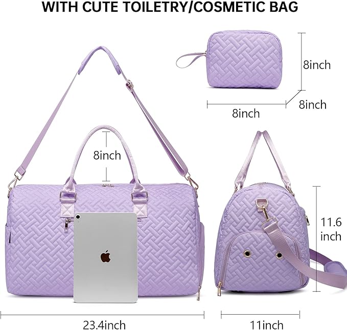 - TRAVEL BAG WITH SHOE COMPARTMENT - We have added a separate shoe compartment and a shoe bag(Size:17x12 inches). Travel bags for women has a shoe compartment to hold your shoes or dirty clothes, making it easy to separate them from your clean clothes when travelling. It also comes with a toiletry bag in which you can put your cosmetics, skincare products or toiletries.(Lavender purple)