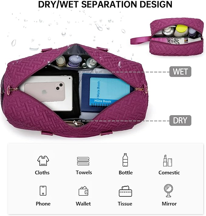 - DRY WET SEPARATED GYM BAG - Duffle bag women has an internal waterproof zipped pocket so if you can put wet clothes or wet stuff inside. It can be put dirty clothes inside either. The bag can not only be used as bag, but also can be hospital bag or mum bag.