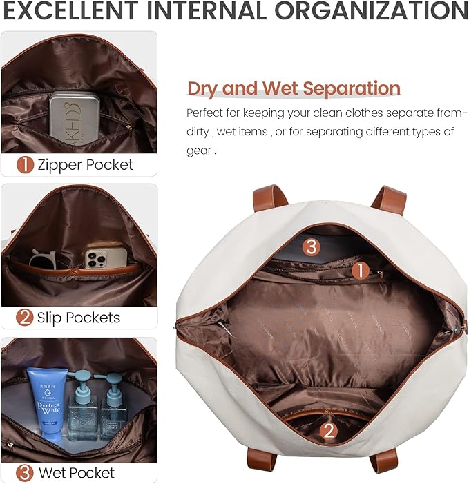 - 【LARGE CAPACITY FOR 5 DAYS TRIP】Large-capacity Weekender Bag is enough to hold the clothes needed for three to five days of trip. The interior features plenty of pockets and compartments to keep small essentials like shoes, laptop and toiletries organized.