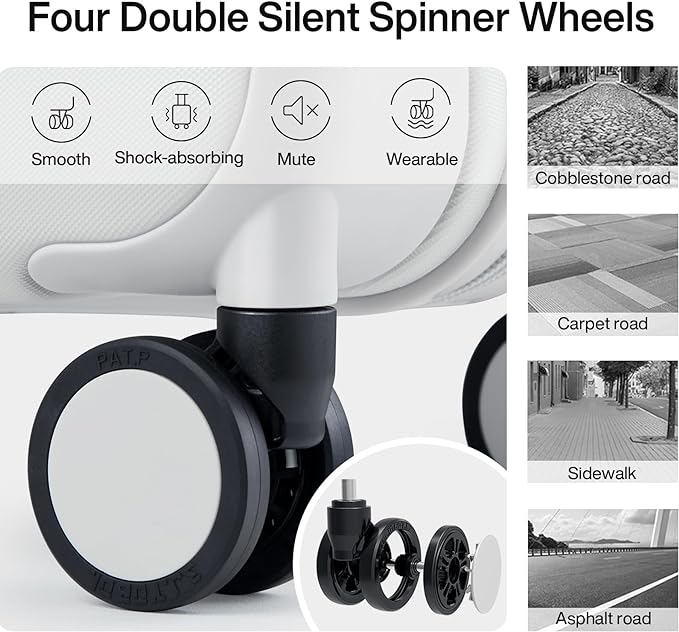 - 【Durable Spinner Wheels 】 Suitecase with spinner wheels for upright 360º mobility for free-weight rolling, it is composed of precision shaft center and thickened TPE wheel skin, which is very wear-resistant,quieter and has strong bearing capacity, It is applicable to different roads such as cobblestone road and carpet road.